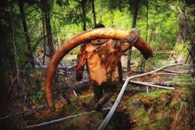 很久前死去的猛犸象的一根巨大的长牙正被人从西伯利亚雅库特的森林中搬运出去。由于猛犸象古象牙极为珍贵,现在已成为一些人非法挖掘的冻土中的宝藏。一根猛犸古象牙大约能卖好几万美元。