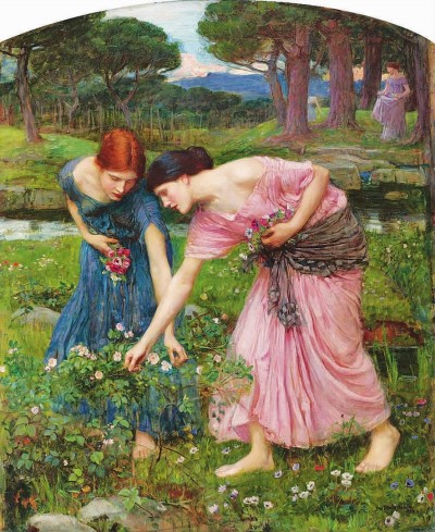 这幅油画,即以上述赫里克一诗的首行“及时采摘玫瑰花蕾”为题,是英国拉斐尔前派画家沃特豪斯的名作。以前介绍过他描绘荷马 《奥德修纪》 和莎剧 《暴风雨》 的作品。此画顶端呈拱形,不甚常见,全画设色淡雅,人物形象气质非凡,可以说又是一帧绝妙的西洋仕女图。原画高100厘米,宽83厘米,完成于1909年,原为私人收藏,辗转数手,上世纪七十年代,此画为一对加拿大夫妇购得。进入本世纪之后,曾两度进入拍卖市场,均未成交。十年前,此画曾出现在苏富比的拍卖目录上,估价高达两百五十万美元。