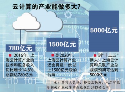根据上海不久前发布的“云海计划3.0”,今后两年内,云计算将成为上海又一个千亿元级规模的新兴产业;而到2020年,该产业还会再进一步,站上1500亿元级的台阶。此外,由于云计算对大数据、移动互联网、人工智能等相关产业的带动效应在2.5到3倍之间,到“十三五”期末,上海云计算和关联产业总规模预期可达5000亿元。届时,云计算产业势必将成为促进传统产业改造、支撑现代服务业发展的核心产业。