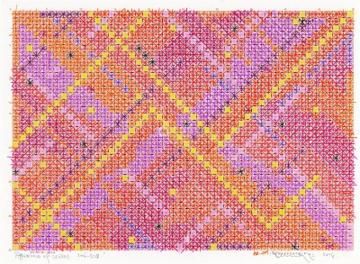 丁乙这位率先进入八五新潮艺术的艺术工作者,最初是以行为艺术作品被记载在中国当代艺术史中,成为“八五新潮美术运动”的上海代表人物之一。1988年,丁乙展开了第一幅“十示”的抽象艺术创作。画面被各色线条分割,从印刷行当借鉴来的“+”字形精准地分布在画布上。通过重复的“+”字形、“×”符号、米字格,细致地构造出纯理性主义的表达。为了画面线条工整,丁乙甚至在油画创作中用上了标尺、胶带和鸭嘴笔,而这些工具一般只有在传统的图案设计中才会出现。看丁乙的绘画,仿佛在审视一件精致的图案作品或刺绣样片。画面上看不到跳跃的笔触和堆积的颜料质感,只有手工一笔一划刻画出的组合异常工整的线性符号。试想,这得有多大的耐性,才能一丝不苟地绘制出如此尺寸的油画。