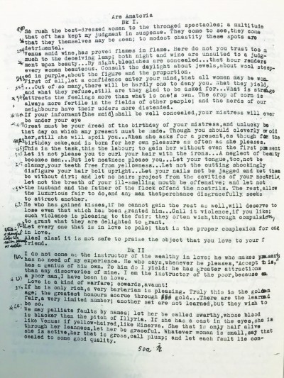 我在这里随意地列举了钱锺书著述或札记中的几处奥维德引文,另外的引文还有很多(《管锥编》就引过至少12处)。囿于篇幅关系和作为文章所限定的某个范围,当然不能逐一全部摆出来。如果真地“假以年寿”,那部题为《感觉·观念·思想》的“西学《管锥编》”终究成书,而且奥维德也真成其中的枢纽作家,那么钱锺书会选择《变形记》还是《爱的艺术》呢?前者显然更著名,但钱锺书明显更喜爱后一部书。可我们总要提防有人会不以为然地提问:就算写成了,这些谈谈“美人痣”或是容貌肤色、“爱的艺术”的话,对我们有什么意义呢?