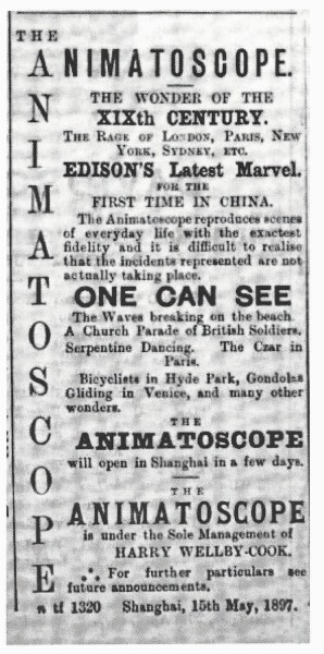 1897年5月15日 《字林西报》 刊出一份放映广告,题为 《“爱泥每太司谷浦”盛大开映之夜》。这是目前发现的最早的一则电影预告。文中将电影称为“爱迪生的最新发明”,风靡伦敦、巴黎、纽约等地的“十九世纪的奇迹”,此行乃为“中国首映”。对于“爱泥每太司谷浦”,预告介绍道:“它能逼真地再现日常生活场景,让你误以为眼前的画面是正在发生的事情”。关于放映的内容,广告中说,你将看到“惊涛拍岸”、“英国阅兵”、“蛇形舞蹈”、“沙皇游巴黎”、“海德公园的单车骑行”、“威尼斯的共渡乐”等天下奇观。放映时间是1897年5月22日 (星期六) 晚8:30入场,9:00开映;现场有音乐伴奏;票价1美元,预订1.5美元。可在布鲁厄公司或饭店入口处购票。发布者署名为“哈利·韦尔比·库克独家经营”。