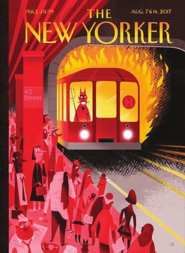 纽约大部分地铁站未安装空调,车厢内的空调偶尔还会因维修关闭,这让在炎炎夏日里挤地铁的纽约人苦不堪言。本期封面创作者鲍勃·施泰克的灵感便源于此,他直言:“比7月在纽约坐地铁更糟糕的体验,只有8月在纽约坐地铁。”