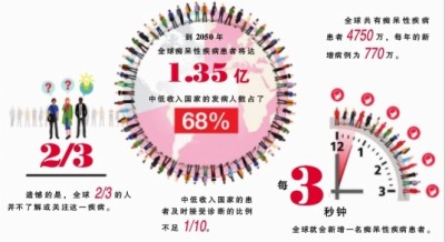全世界目前痴呆性疾病患者有4750万,其中58%生活在中低收入国家,每年新增病例为770万。据估计,每100位60岁及以上人口中,就有5至8名痴呆性疾病患者。我国已确诊的痴呆性疾病患者人数为1000万,约占世界发病总数的1/4。
