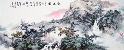 《观山图》为近作。画家以疏繁有致的笔触,浓淡相宜的墨色,精心布置的构图,传神细致的刻画,把秋情胜春朝的诗心哲理表现得生动而舒畅。秋山起伏,蜿蜒入云;繁树夭矫,秋色轻染;溪声淙淙处,有孩童携琴观瀑;云气氤氲处,一抹晚霞染红远峯;黄叶点金,青山秀绝。她用笔爽朗,敷色清丽,画境开阔,意趣活泼,全无秋之萧瑟冷落,满是生机郁勃。而《河流一带明》则以痛快淋漓的水墨展现绝壁叠嶂的险胜,河湾洄流的平缓,远帆归鸟的轻灵,茂树渔村的掩映,王丽红细细写来,把传统题材融入崭新理念,清丽宁静、沉稳灵动,读之心旷神怡。