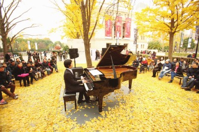 第五季“银杏音乐会”昨天中午如期上演,本次“银杏音乐会”以纪念贝多芬逝世190周年为主题。图为在银杏叶铺成的金色“地毯”上,市民感受音乐带来的纯真与感动。 本报记者 叶辰亮摄▲ 相关报道刊第三版