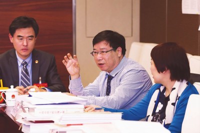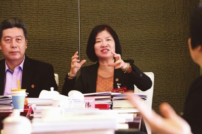 右上图:在徐汇代表团小组审议会场,茹国明代表 (左) 谈审议体会。