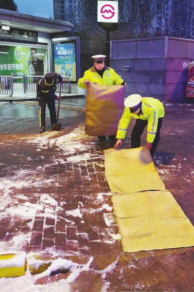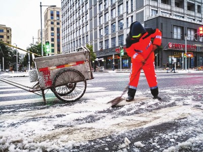 清晨5时,陈伟和141名同事全员在岗,清扫地面积雪,累了就轮流在班房休息。陈伟是静安城发集团环卫作业二分公司上海站综合保洁班业务条长,负责上海站南广场、北广场和白玉兰广场三处共11.9万平方米和站区12条道路的保洁。当天,全市共组织环卫、绿化等清洁人员5万余人次,使用8万多个麻袋草包,基本确保主要道路路面、人行道等无积雪积冰现象。