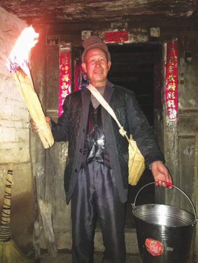 大年初一的凌晨,花炮的味道还未散去,普建有醒了。他轻轻地掀开被子,披上外套,一个人走出门外。在院子里,他拿着砍刀,劈开8条差不多等长的劈柴,捏紧之后,用火机挨条点燃,不一会儿,一个熊熊燃烧的简易火把就制成了。