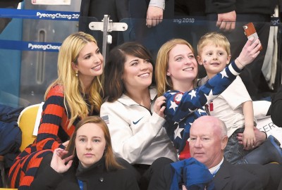 右图:24日,伊万卡(后左一)在江陵冰壶中心观看男子冰壶决赛美国队与瑞典队的比赛。新华社发