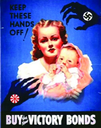 在这两张宣传海报中,女性表现出的是弱势群体的形象。美国宣传海报正是利用了这种情感上的煽动,激发男子参加战斗、号召公民购买战争债券。据统计,整个二战期间,有超过8500万美国人参与购买了总计1857亿美元的战争债券,维持了美国战争机器的有效运转。