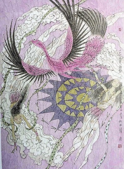 最终,朱新昌决定用当代审美复活上古神怪。在他画的 《山海经》 系列中,造型方面看得出汉代画像砖、京剧脸谱等传统美术的影子,细微之处却不乏卡通般的趣味。“平时我会看些卡通片,尤其喜欢宫崎骏的动画,特别佩服里面丰富的想象力和可爱的造型。”朱新昌直言。书中角色形象被适度夸张、变形,这些并不十分写实的图样似乎形成一种颇具象征意味的现代抽象构成。画面人物线条、水波纹路略带装饰感,这正是一种深受当代人喜爱的视觉特质。朱新昌也用斑斓、明丽的色彩丰富着传统国画的表现力。“传统国画用的是矿物质颜料,色彩很有限,这次除了国画颜料,我还特意选用了一些国外的水彩颜料。”诸多的尝试,让朱新昌的 《山海经》 图绘与古人笔下的 《山海经》 拉开了距离。