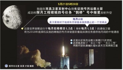 据新华社西昌5月21日电 (记者白国龙 余晓洁)21日5时28分,我国在西昌卫星发射中心用长征四号丙运载火箭,成功将探月工程嫦娥四号任务“鹊桥”号中继星发射升空。这是世界首颗运行于地月拉格朗日L2点 (简称地月L2点) 的通信卫星,将为2018年底择机实施的嫦娥四号月球背面软着陆探测任务提供地月间的中继通信。