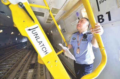 “从这里到329机位,大约3公里,要穿过两条飞机跑道,所以要特别小心。”老羊说。机坪路口的警示灯,在热浪的干扰下,带给人不停扭动的错觉,但对老羊来说,信号灯的位置、航班何时起降、航班的出发地与目的地,这一切早已了然于心。他说:“天气晴朗,即使温度再高,机坪驾驶也是相对安全的,因为视线比较清晰,要是遇见雷雨天气,那就要谨慎才行,安全第一。”如果车子出现故障,在飞机跑道附近抛锚,不仅会影响其他车辆的通行,还可能对航班起降造成严重影响,所以,每次驾车执勤前,他都会先给警车做个“体检”,轮胎、引擎、警灯、油量全部检查一遍。当然,他时刻不忘的还有国门安全。执行货机清舱任务时,装满货物的机舱只留出一个人通行的走道,空气混浊、空间狭小,但他从不放过任何蛛丝马迹。