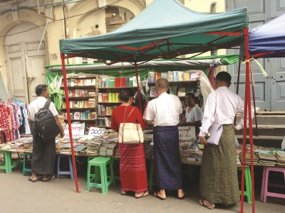 不过,十天后我们结束旅程回到仰光,在酒店附近一条小街,见到了绵延整条街的书摊,就像“街边大学”搬到了这里。这条街的两边人行道上,书摊紧密相连,有几百米长,放书的木板下垫着色彩鲜艳的塑料小凳子,顶上有蓝色为主间隔一两块红色的篷布,色彩悦目。不少摊位,书和杂志堆得老高,快要碰到顶上的篷布。